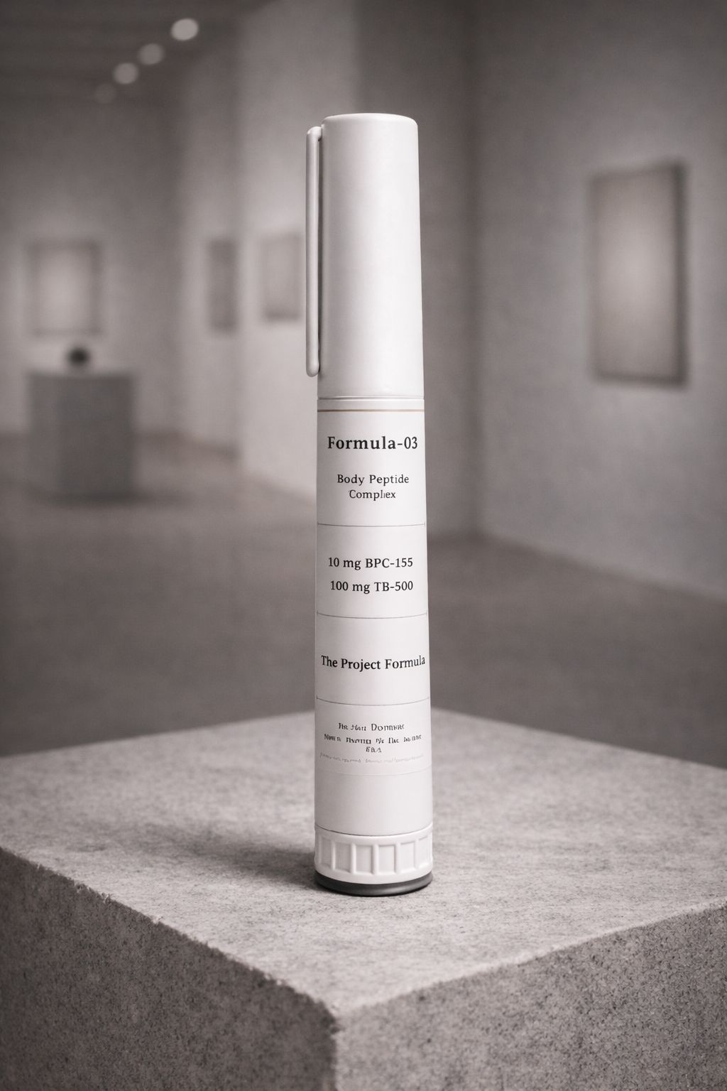 Formula 03 combines two synthetic peptide compounds—BPC-157 and TB-500—commonly referenced in scientific literature and laboratory research exploring peptide structure, stability, and molecular interaction pathways.